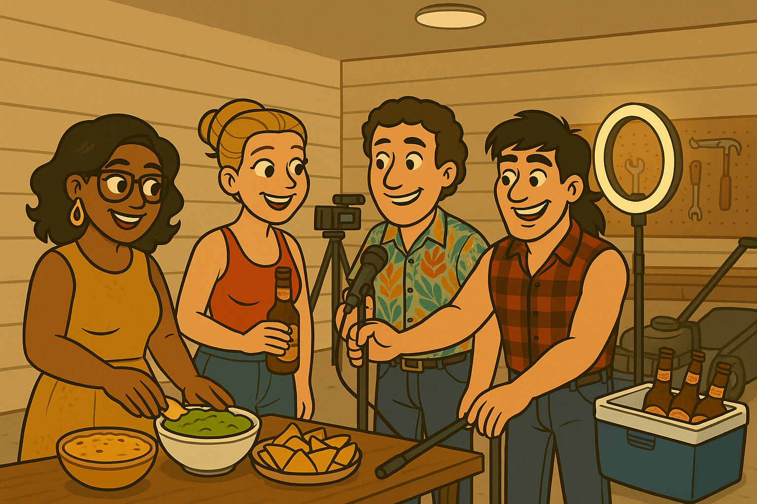 Millie and Hillary rolled their eyes in perfect synchronization. They were stationed in the kitchen, whipping up appetizers like generals leading a snack battalion. Meanwhile, the guys fumbled with tripods, lights, and enough cords to power a Willie Nelson tour bus.
